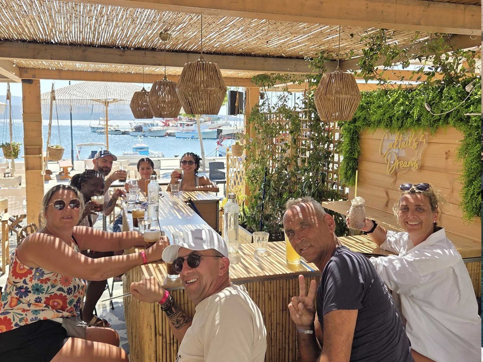 Repas grec à bord: « À l’heure du déjeuner, savourez un véritable moment de partage et de convivialité à bord, avec un repas typiquement grec mettant à l’honneur un barbecue de poisson, la salade grecque et un apéritif Ouzo, le tout face à la mer dans une ambiance détendue. »