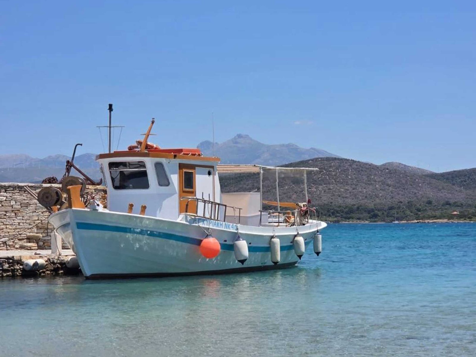 Embarquement à Marmari, au cœur de la vie locale: Nous embarquons depuis le port authentique de Marmari, au contact de la vie quotidienne des pêcheurs. Votre capitaine local vous accueille à bord d’un bateau traditionnel, dans une atmosphère simple, chaleureuse et authentique.